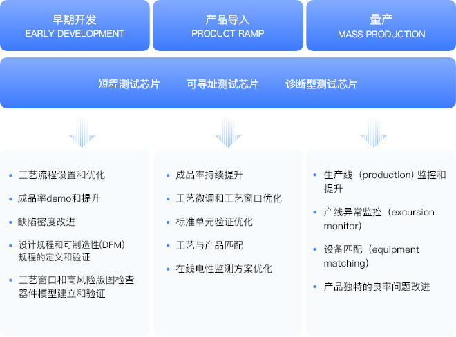 以典型逻辑工艺为例,其生命周期,大致包括早期开发、产品导入和量产环节。整个过程以工艺迭代和成品率提升为主线,需建立并验证设计服务所需的PDK;快速导入客户产品,并保证产品的可靠性和制造过程的稳定性。这个过程中,需要大量实测数据作为支撑。